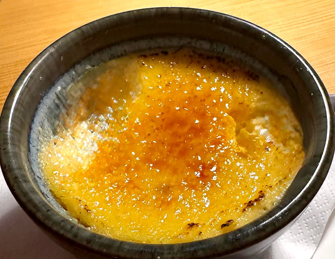 Außerdem gab es vorweg die Jakobsmuschel mit Birne – ein spannendes Zusammenspiel von maritimem Geschmack und fruchtiger Frische – und anschließend das Rindertatar, das am Tisch unter einer Glosche geräuchert wurde und daher zum besonderen Erlebnis wurde. Zum Dessert gab es eine cremige Crème brûlée mit eingelegten Birnen, deren Vanillenote und Karamellkruste den kulinarischen Abend abrundeten.